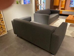 Bankstel met stof waarvan 1x 190 cm breed en 1x 170 cm breed. Chroom pootje.